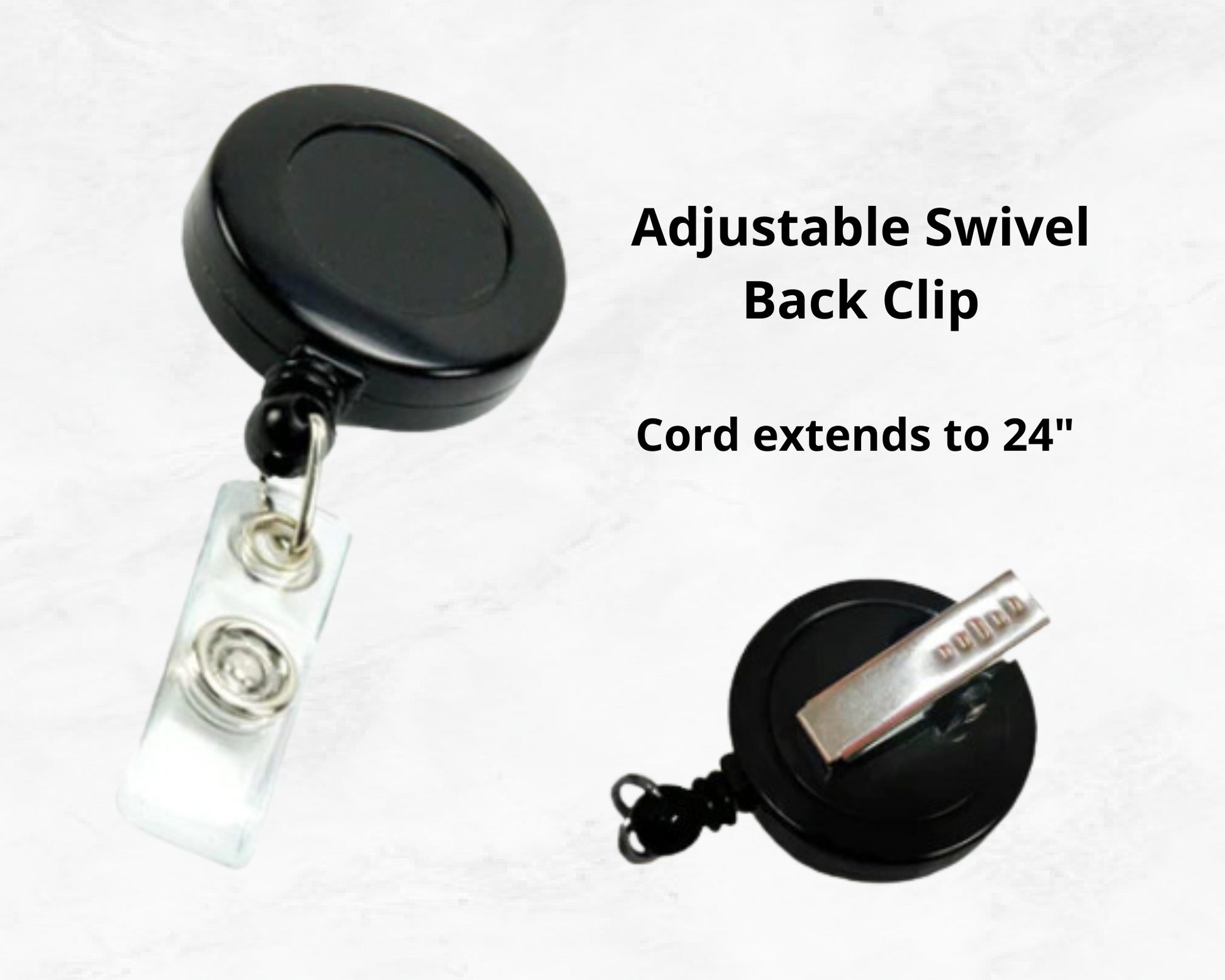 - Convenient alligator style metal clip on back.